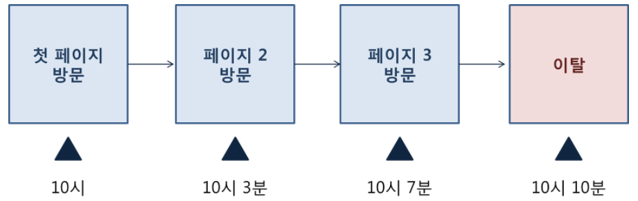 4분간 두 번째 페이지를 살펴보고 세 번째 페이지를 본 후 다른 사이트로 넘어갔다. 이 경우, 페이지2 체류시간 = 페이지3 방문시간 - 페이지2 방문시간이 된다.